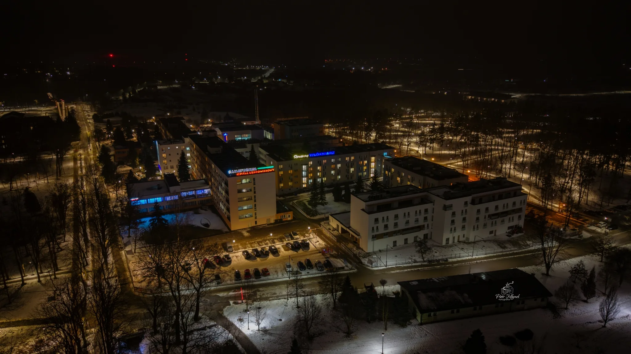 Busko-Zdrój nocą zachwyca równie mocno. Na fotografiach uchwycony został zarówno stary, jak i nowy Park Zdrojowy. Starsza część parku wyróżnia się klimatyczną iluminacją oraz zabytkowym budynkiem Sanatorium Marconi, który po zmroku wygląda wyjątkowo dostojnie. Nowy Park Zdrojowy przyciąga uwagę nowoczesną tężnią solankową, stanowiącą dziś jeden z symboli miasta.
