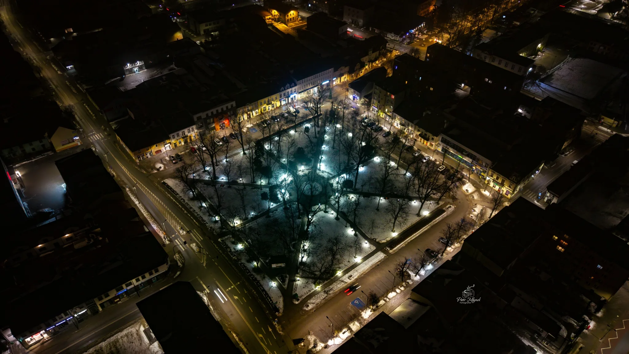 W kadrze znalazł się także rynek Buska-Zdroju wraz z Parkiem Miejskim. Z lotu ptaka widać układ alejek, zieleni i miejskich świateł, które tworzą spójną i spokojną nocną przestrzeń.